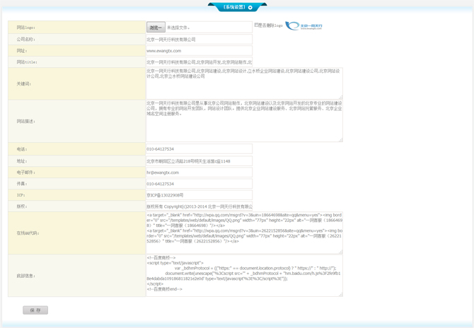 3、網(wǎng)站所有者信息設(shè)置(電話、地址、電子郵件、傳真、ICP、版權(quán)、在線QQ代碼、底部信息),這些內(nèi)容將在網(wǎng)站的固定位置進(jìn)行展示,宣傳公司信息!